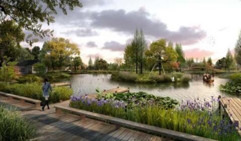 依托現(xiàn)狀地形地貌,打造親水平臺(tái),結(jié)合用地規(guī)劃打造條狀小游園。